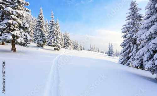 © Vitalii_Mamchuk, Fototapeta premium The path leads to the snowy forest.