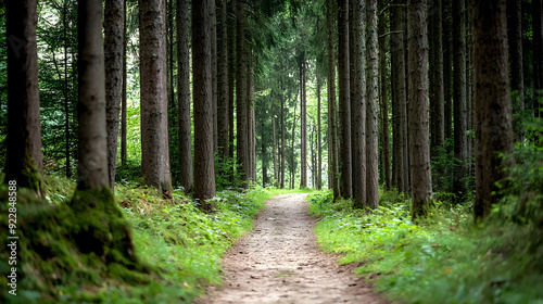 © Natthapong, Naklejka premium The Path Through the Woods: A winding dirt path meanders through a dense forest, sunlight filtering through the towering pines and illuminating the lush green undergrowth, inviting the viewer to explo