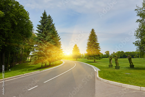 © Ryzhkov Oleksandr, Fototapeta premium The paved road up the side of the trees, a freight train on a Sunny day
