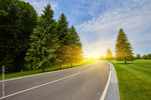 © Ryzhkov Oleksandr, Fototapeta premium The paved road up the side of the trees, a freight train on a Sunny day