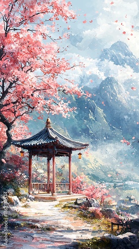 Fototapeta premium The pavilion under the cherry blossom tree