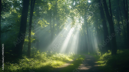 © Xingguo, Fototapeta premium The peaceful forest path was shrouded in mist, with tall trees lined up in rows and the sun shining through the branches, creating a Tyndall light effect.