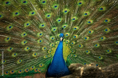 Naklejka premium the peacock has feathers full of bright blue green and white