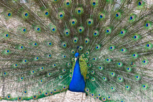 Obraz premium The peacock shows its beautiful tail with multi-colored feathers