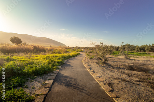 © yosefhay, Naklejka premium The pedestrian asphalt path surrounded by Stones near olive trees and wild plants
