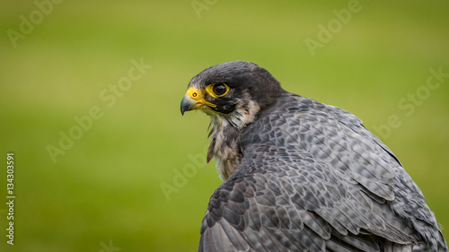 Fototapeta premium The peregrine falcon (Falco peregrinus), historically known as the duck hawk in North America, a bird of prey in the Falconidae family. It has yellow cere and feet and black beak and claws. Copy space