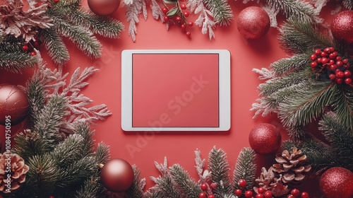 © peppastocker, Fototapeta premium The perfect seasonal mockup with festive holiday flatlay, featuring a white tablet with pine branches, ornaments, and berries on coral background.