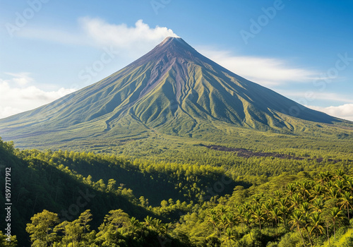 © tuelekza, Fototapeta premium The perfectly symmetrical cone of Mayon Volcano stands majestically against a clear blue sky, surrounded by lush green landscapes, including rice fields and palm trees, in the Philippines
