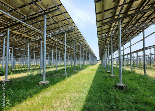 © Tinglee, Obraz premium The perspective under Solar PV panel for Ground Mounted Solar farms Power Plant.