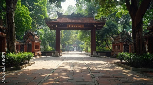 Obraz premium The photo shows the entrance to a traditional chinese courtyard with red...