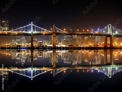 © Luca, Naklejka premium The photograph captures a breathtaking view of a city skyline at night. The skyscrapers are illuminated by bright lights, and the reflections in the water below create a stunning mirror effect. In the