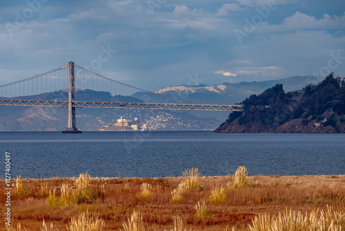 Naklejka premium The photograph captures the serene morning atmosphere with calm waters of the San Francisco Bay, the iconic bridge structure, and the historic Alcatraz Island.