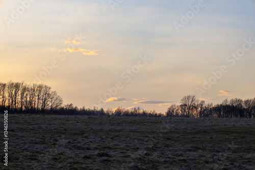 Obraz premium The photograph depicts a peaceful evening landscape with a field in the foreground and a line of trees on the horizon. The sky is painted in soft shades of sunset, with small clouds adding dynamics.