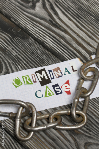 © f2014vad, Fototapeta premium The phrase Criminal case made of letters cut from a magazine and pasted on a sheet of paper. There is a metal chain nearby. On brushed pine boards painted black and white.