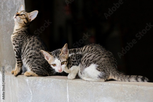 © Wissawa, Naklejka premium The picture of two cat sitting on wall looking cute. Concept photo of animal life.
