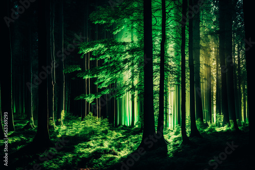 Fototapeta premium The picture shows a forest with backlight shining through the trees.