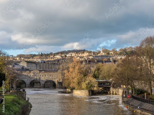 Naklejka premium the picturesque horseshoe weir at Pulteney Bridge built in the 1600s to...