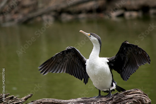 © susan flashman, Fototapeta premium the pied cormorant is drying his wings