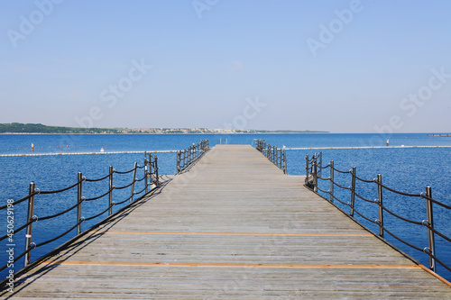 Obraz premium The pier near beach against blue sky in sunny day. Adriatic coast and sea in...