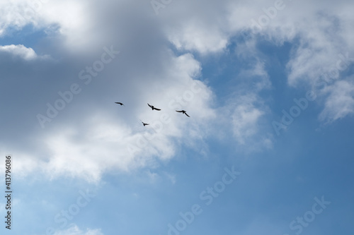 © nkeskin, Obraz premium The pigeons are flying on the blue sky