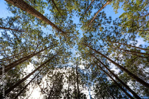 © Quang, Fototapeta premium The pine trees tops vertical on blue sky
