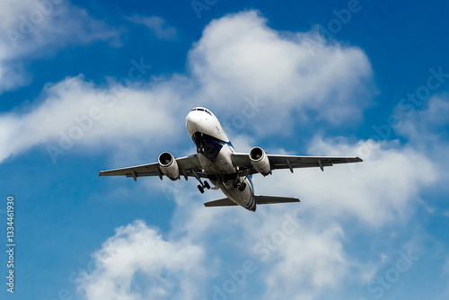 Fototapeta premium The plane flies through a clear blue sky, surrounded by fluffy white clouds....