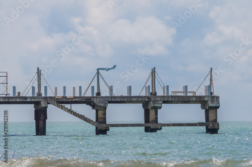 © yaroslav1986, Fototapeta premium the plane is flying over the pier