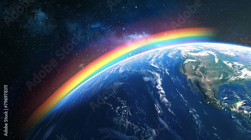 © Gr33n, Obraz premium The Planet Earth has a rainbow coming from it extending into space