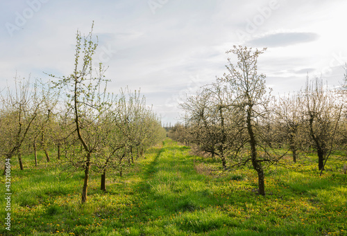 © SkyLine, Fototapeta premium The plantation of young apple trees in the farm