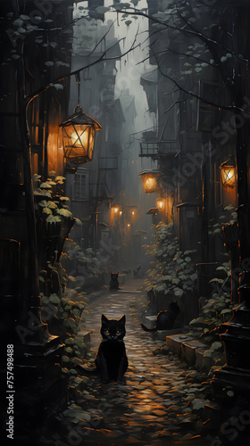 © QuantumQuotient, Obraz premium The playful chaos of a group of mischievous black cats frolicking in a moonlit lane, their bright eyes and arched backs adding an air of mysterious fun, painting Generative AI