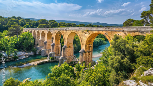 © Nuttapong, Fototapeta premium The Pont du Gard, a majestic Roman aqueduct bridge with three tiers of arches, stands tall against a summer sky in southern France