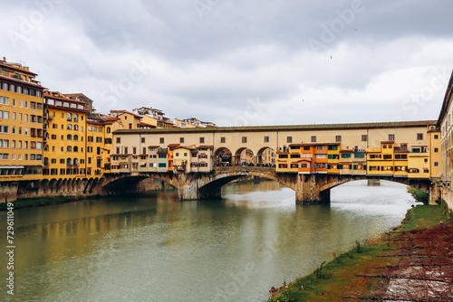 Fototapeta premium The Ponte Vecchio, a medieval stone closed-spandrel segmental arch bridge...