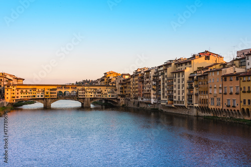 © Nick Kypriadis, Obraz premium The Ponte Vecchio bridge over the Arno River at sunset.