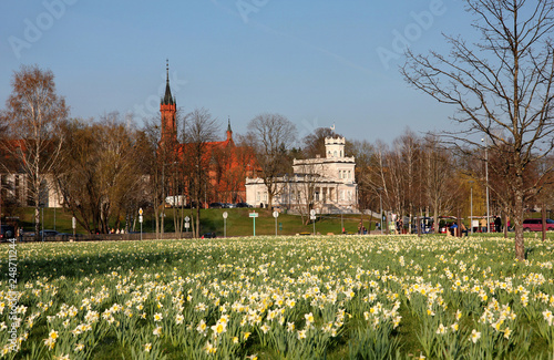 © Olga Fradkin, Obraz premium The popular daffodil park in Druskininkai Thousands of flowers are blooming. at the same time. The landmarks of the town are at the background.