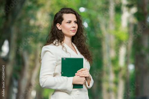 Fototapeta premium The portrait of a business woman with a notebook in her hand. Smartly dressed girl outside. Successful white european woman