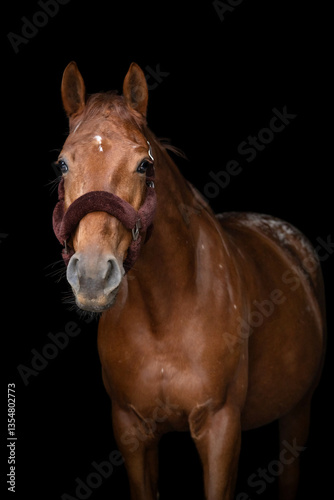© Vilma, Obraz premium The portrait of brown and white horse in black background, fine art