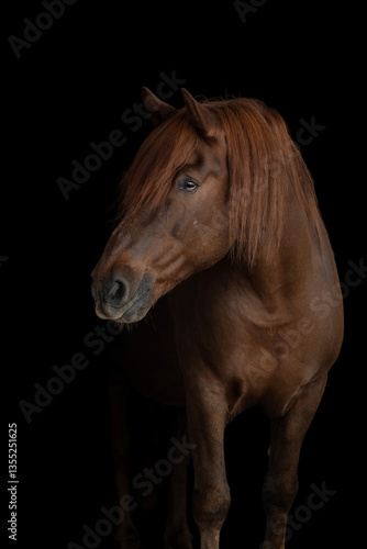 © Vilma, Obraz premium The portrait of majestic brown horse in black background, fine art photography