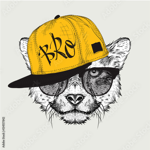 Naklejka premium The poster with the image cheetah portrait in hip-hop hat. Vector illustration.