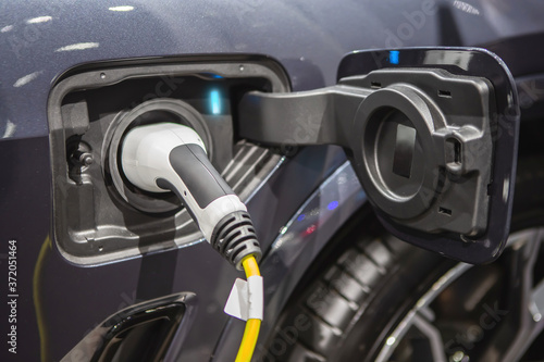 © Nitiphol, Fototapeta premium The power supply plugged into an electric car to charging a battery at the charging station