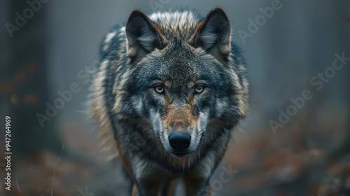 Fototapeta premium the powerful presence of a gray wolf walking through a misty forest with its piercing gaze and impos