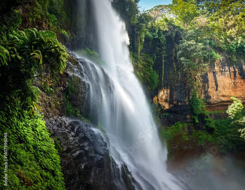 © Vitali, Obraz premium The powerful spray of a waterfall cascading down a rocky cliff surrounded by lush vegetation.