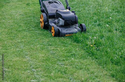 © Andrei Sasin, Fototapeta premium The process of mowing grass or lawn with a mower. Landscaping. The gardener works with the lawn