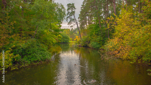 Fototapeta premium The prospect of a river surrounded by an autumn forest.