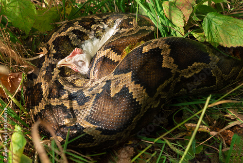 © Михаил Князев, Fototapeta premium The Python has captured its prey. Capture a chicken with a boa constrictor. Boa in the grass