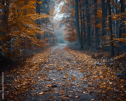 Fototapeta premium The quiet beauty of a forest path in autumn, leaves gently passing to the ground, symbolizing the cycle of life and nature’s serenity