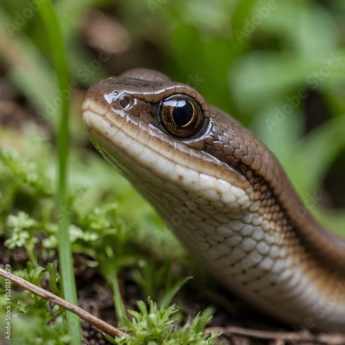 Naklejka premium The Quiet Gaze: A Slow Worm's Face Amidst Blurred Green Foliage