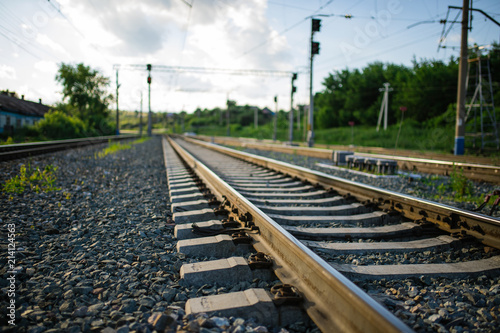 © Dima, Naklejka premium The railway engine of a freight locomotive that crosses the desert during sunset. Large transport of goods in tanks by rail. railway rails