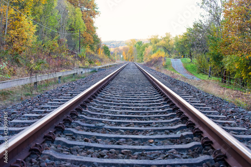 © Marcus Beckert, Fototapeta premium The railway track through the wood in Autumn