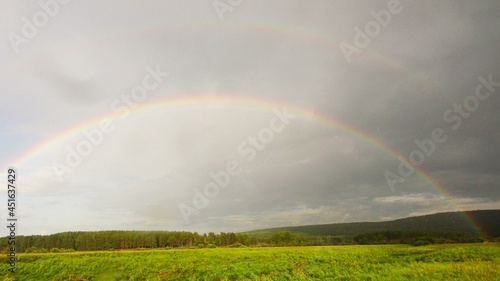 © Alexander, Fototapeta premium The rainbow over the pine forest is the real beauty of Siberia. Light rain and a breeze perfectly complement this picture