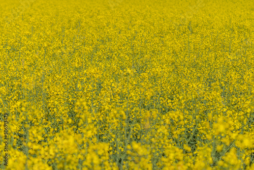 © michaldziedziak, Obraz premium The rapeseed blooms with yellow flowers. Closeup. Selective focus.